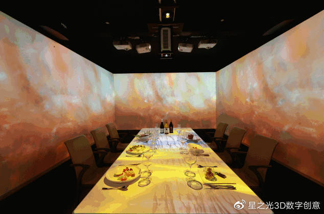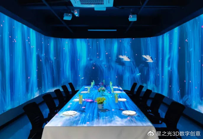 全息餐廳多個題材的場景切換,不需要太高的技術(shù)含量,可以用白色的墻壁投影,不用做太多的裝飾,也可以用圓桌、方桌、長桌等多種形式進行投影。