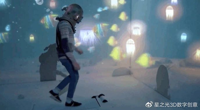 這個(gè)工作使用了投射技術(shù),產(chǎn)生了許多很有意思的效果,它確實(shí)凸顯了這項(xiàng)技術(shù)的潛力。觀看演員們與燈光互動(dòng)-下樓梯,伸手觸摸并不存在的門(mén)把手,乘地鐵,漫游海底,跳進(jìn)未知的山洞…盡情享受這一旅程!